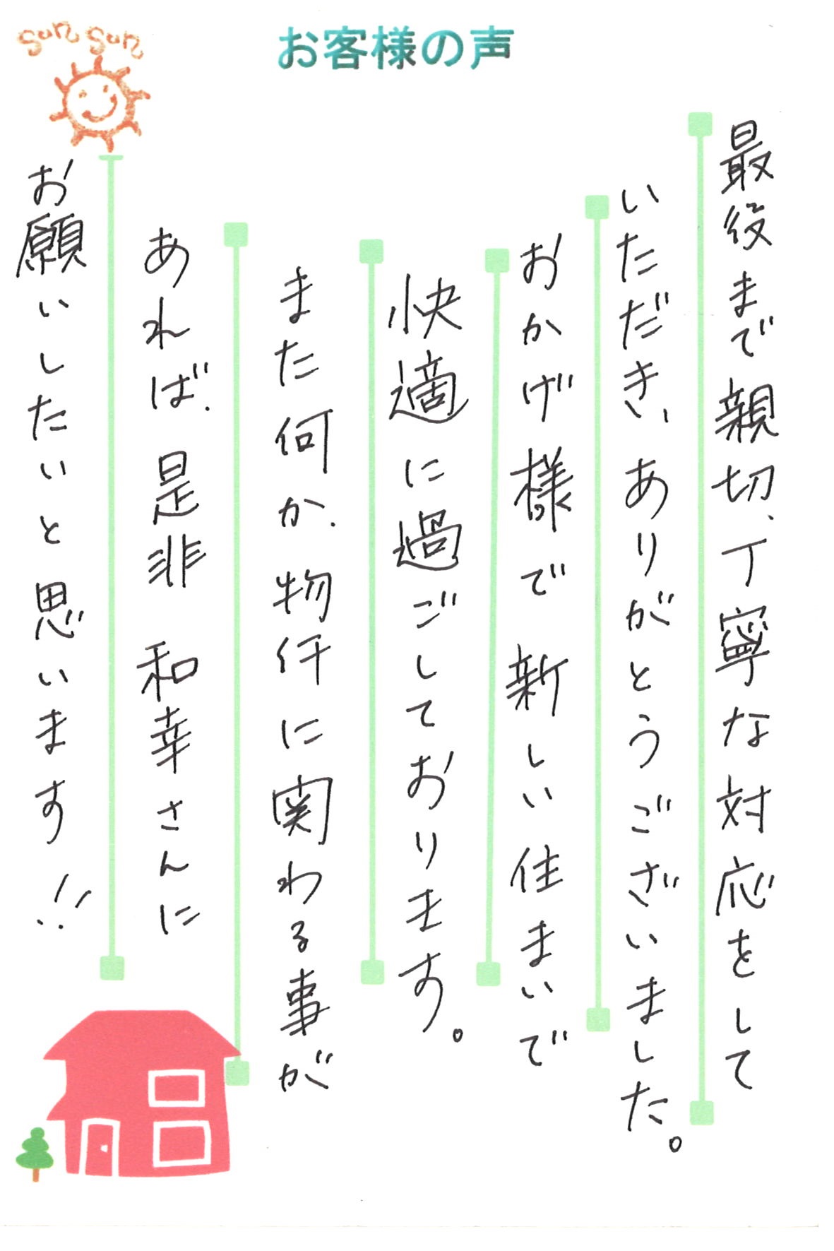 お客様の声 「お客様の声」こそが 和幸の喜びです! 賃貸物件ご契約 N様 新築戸建ご購入 Y様 マンションご購入 K様 マンションご購入 W様 マンションご売却 O様 投稿ナビゲーション 1 2 3 次